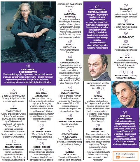 Ponadto, w nowym numerze magazynu czytelnicy znajdą m.in. recenzje nowych książek Barnesa, Masłowskiej, Eugenidesa i Tokarczuk, czyli najważniejszych premier tej wiosny, a także wiersze Krzysztofa Siwczyka i Elizabeth Bishop. Wojciech Nowicki sportretował (złośliwie) słynną fotografkę Annie Leibovitz, a Katarzyna Wężyk opowiada (z anegdotami) o historii egzystencjalizmu, najbardziej seksownej filozofii XX wieku. Literacką klasykę w komiksie interpretuje tym razem Jan Koza. O tym „Co czyta świat” czytelnicy dowiedzą się z felietonów Natalii Szostak i Macieja Jarkowca, a Michałowi Nogasiowi „Przy biurku” o swojej pracy opowiada reporterka Magdalena Grzebałkowska, która właśnie wydaje biografię Krzysztofa Komedy.
