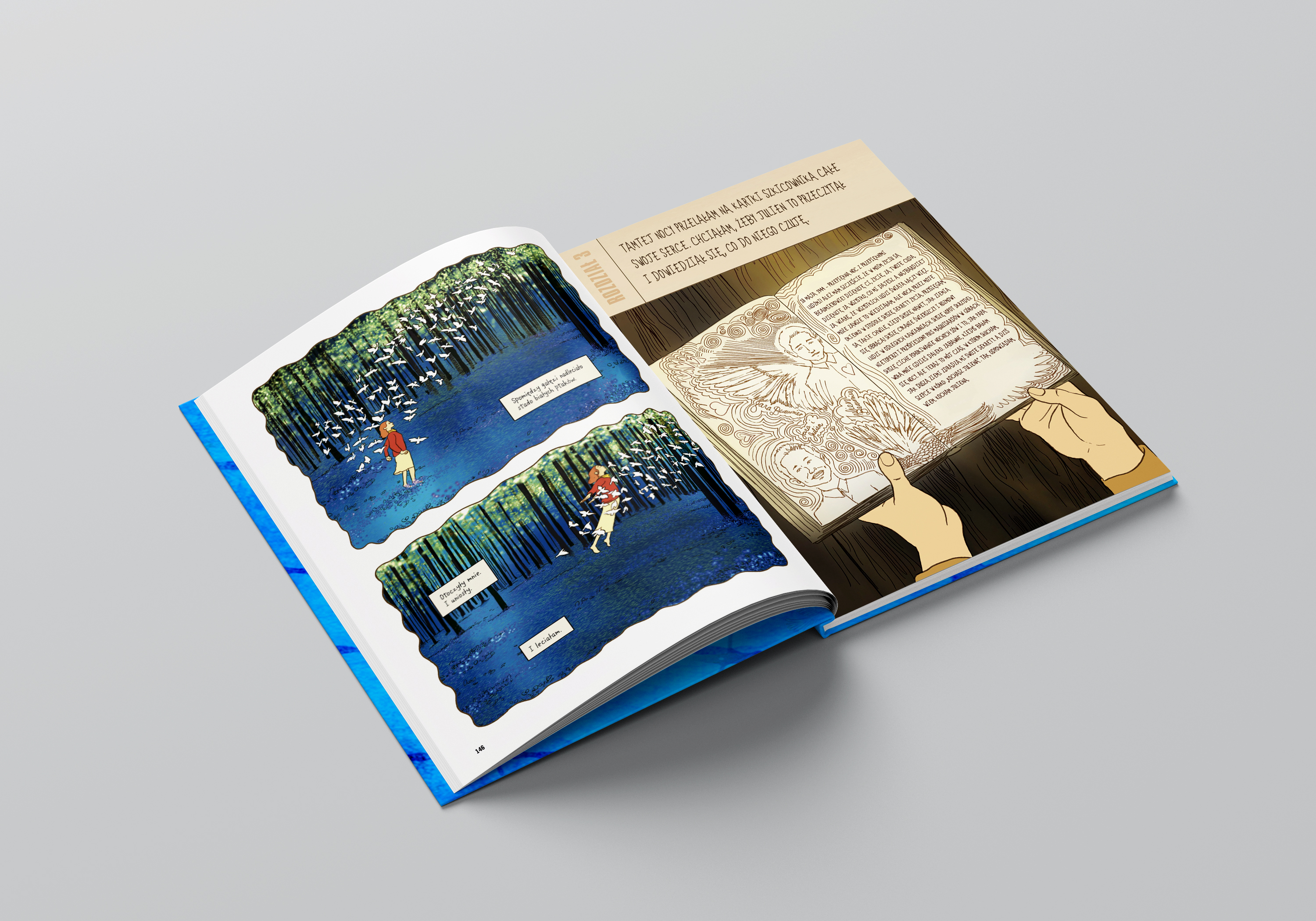 Bardzo dziękuję. Swoją karierę zaczęłam jako ilustrator, dlatego też szczególnie miły był dla mnie swoisty powrót do korzeni, aby opowiedzieć historię, która zawierała zarówno elementy wizualne, jak i słowne. Myślę, że jednym z powodów, dla których tak bardzo lubiłam pracować w tym medium, jest to, że jest ono bliższe nakręceniu filmu niż opowiadaniu historii. Element wizualny równocześnie zadaje i odpowiada na wiele pytań, nad którymi zastanawia się reżyser: jak wizualnie przekazać historię? Mówimy o ustawieniu sceny, skomponowanie ujęcia filmowego, dekorowaniu planu, wyborze tła, obsadzeniu postaci, przygotowania kostiumów, a następnie zapewnienie bohaterom dialogu – a więc tego wszystkiego, co robi się w filmie. Użyłam dużo światła i ciemności w obrazach wizualnych, ponieważ dużo o tym mówię w sposób metaforyczny: światło i ciemność znajduje się przecież wewnątrz ludzi. Stodoła, w której ukrywa się główna bohaterka, jest przede wszystkim ciemna, ale światła szuka ona przez szczeliny w ścianach i małe okienko. To bardzo celowy zabieg.