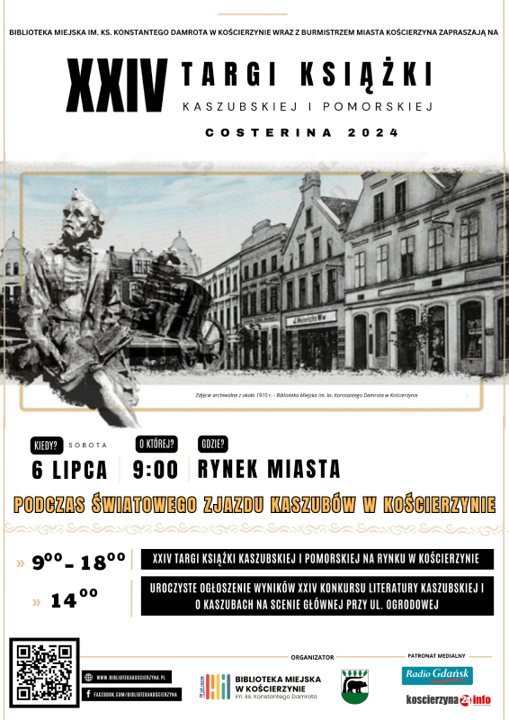 Biblioteka Miejska im. ks. Konstantego Damrota w Kościerzynie wraz z Burmistrzem Miasta Kościerzyna zapraszają do udziału w XXIV Targach Książki Kaszubskiej i Pomorskiej COSTERINA, które odbędą się na Rynku w sobotę 6 lipca 2024 roku od godz. 9.00 do godz. 18.00 podczas Światowego Zjazdu Kaszubów w Kościerzynie.
