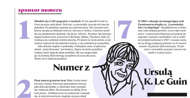 Sponsorką nowych „Książek” jest Ursula K. Le Guin. Czego nie wiecie o autorce doskonałego „Ziemiomorza”? Być może tego, że pisze od samego rana i wstaje o 5.30. Że pisarką chciała zostać od dziecka, pisać nauczył ją starszy brat, a pierwsze opowiadanie stworzyła jako dziewięciolatka. Co jeszcze? Sprawdźcie w sierpniowym numerze.