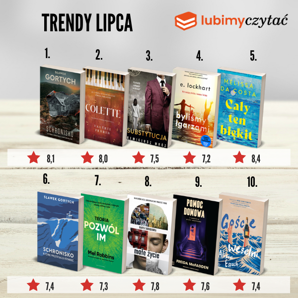 Pierwszą piątkę otwiera Mélissa Da Costa. 1,5 miliona sprzedanych egzemplarzy we Francji robi wrażenie i podobną miłością „Cały ten błękit” pokochał polski czytelnik. Średnia nota poruszającego obrazu relacji międzyludzkich, które rozkwitają w chwili, gdy wydawało się, że wszystko dobiegło końca, to wyjątkowo wysokie 8,4/10. Opowieść o miłości rodzącej się z bólu i o pięknie ukrytym w najmniejszych gestach to piąta najpopularniejsza książka lipca.