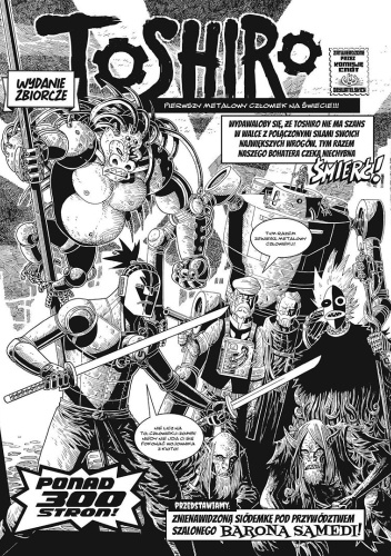 Mieszanka steampunku, westernu, horroru i opowieści samurajskich. Toshiro - pierwszy metalowy człowiek na świecie, mechaniczny samuraj, który z mieczem w dłoni, ale też wykorzystując najnowsze zdobycze techniki XIX wieku, broni ludzkości przed niezwykłymi zagrożeniami, od Japonii, przez Europę, aż do Stanów Zjednoczonych. W jednym tomie zostały zebrane wszystkie wydane dotychczas przygody Toshiro: poczynając od pierwszego pojawienia się metalowego wojownika z Kioto w „Produkcie” nr 23 z roku 2004, poprzez publikacje w zinach „TFUR” i „Pirat”, występy w magazynie „SMASH!”, antologii „KKK#25” i albumie „Josephine: Tchnienie Czarnego Lądu” z wydawnictwa Mandragora, aż po „Kieszonkową Apokalipsę” - album wydany wcześniej przez Dark Horse i Kulturę Gniewu, tym razem z oryginalnym tekstem oraz zupełnie nowymi planszami.